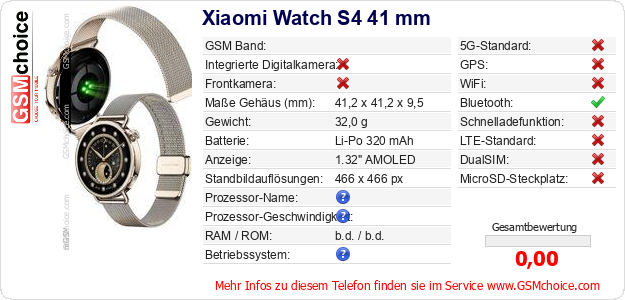 Daten des Mobiltelefons Xiaomi Watch S4 41 mm auf Ihrer Seite