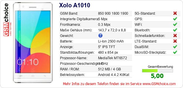 Hast du eigene Webseite? Willst du die Informationen über Standarddaten des Handys Xolo A1010 irgendwo veröffentlichen? Das ist sehr einfach. Du kannst das Bild herunterladen oder kopieren und auf der Webseite folgenden Code hinzufügen:Das Einfügen von diesem Code verursacht das Anzeigen von dem folgenden Bild: