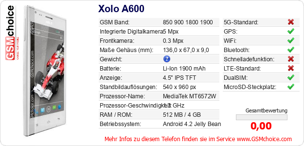 Hast du eigene Webseite? Willst du die Informationen über Standarddaten des Handys Xolo A600 irgendwo veröffentlichen? Das ist sehr einfach. Du kannst das Bild herunterladen oder kopieren und auf der Webseite folgenden Code hinzufügen:Das Einfügen von diesem Code verursacht das Anzeigen von dem folgenden Bild: