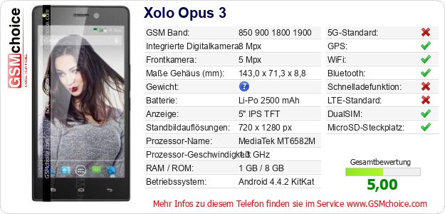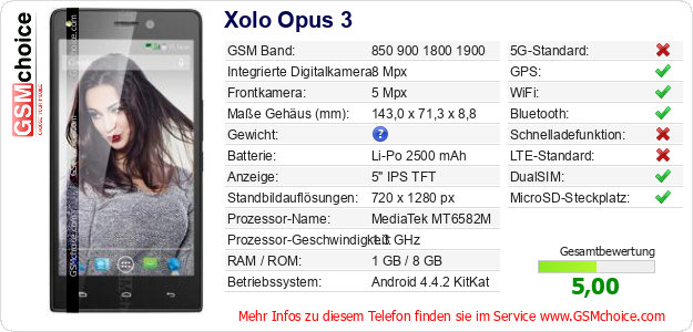 Hast du eigene Webseite? Willst du die Informationen über Standarddaten des Handys Xolo Opus 3 irgendwo veröffentlichen? Das ist sehr einfach. Du kannst das Bild herunterladen oder kopieren und auf der Webseite folgenden Code hinzufügen:Das Einfügen von diesem Code verursacht das Anzeigen von dem folgenden Bild: