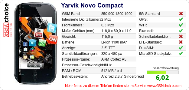 Hast du eigene Webseite? Willst du die Informationen über Standarddaten des Handys Yarvik Novo Compact irgendwo veröffentlichen? Das ist sehr einfach. Du kannst das Bild herunterladen oder kopieren und auf der Webseite folgenden Code hinzufügen:Das Einfügen von diesem Code verursacht das Anzeigen von dem folgenden Bild: