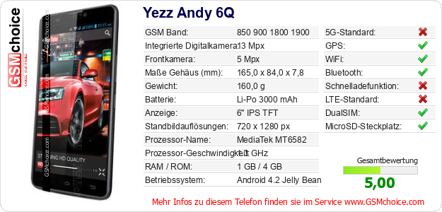 Hast du eigene Webseite? Willst du die Informationen über Standarddaten des Handys Yezz Andy 6Q irgendwo veröffentlichen? Das ist sehr einfach. Du kannst das Bild herunterladen oder kopieren und auf der Webseite folgenden Code hinzufügen:Das Einfügen von diesem Code verursacht das Anzeigen von dem folgenden Bild: