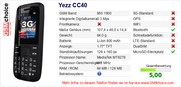 Hast du eigene Webseite? Willst du die Informationen über Standarddaten des Handys Yezz CC40 irgendwo veröffentlichen? Das ist sehr einfach. Du kannst das Bild herunterladen oder kopieren und auf der Webseite folgenden Code hinzufügen:Das Einfügen von diesem Code verursacht das Anzeigen von dem folgenden Bild: