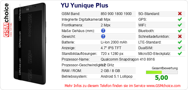 Hast du eigene Webseite? Willst du die Informationen über Standarddaten des Handys YU Yunique Plus irgendwo veröffentlichen? Das ist sehr einfach. Du kannst das Bild herunterladen oder kopieren und auf der Webseite folgenden Code hinzufügen:Das Einfügen von diesem Code verursacht das Anzeigen von dem folgenden Bild: