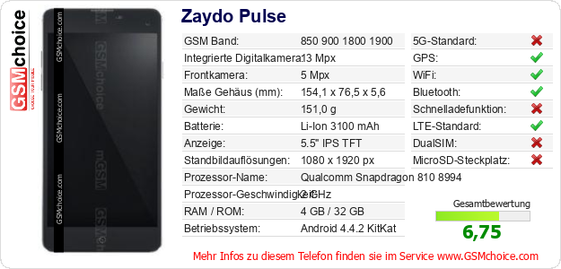 Hast du eigene Webseite? Willst du die Informationen über Standarddaten des Handys Zaydo Pulse irgendwo veröffentlichen? Das ist sehr einfach. Du kannst das Bild herunterladen oder kopieren und auf der Webseite folgenden Code hinzufügen:Das Einfügen von diesem Code verursacht das Anzeigen von dem folgenden Bild: