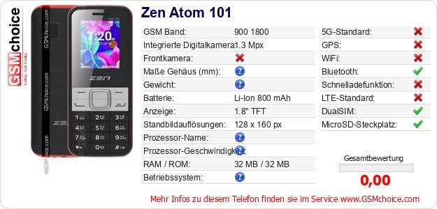 Hast du eigene Webseite? Willst du die Informationen über Standarddaten des Handys Zen Atom 101 irgendwo veröffentlichen? Das ist sehr einfach. Du kannst das Bild herunterladen oder kopieren und auf der Webseite folgenden Code hinzufügen:Das Einfügen von diesem Code verursacht das Anzeigen von dem folgenden Bild: