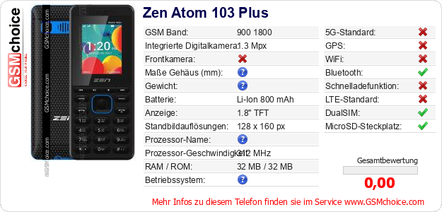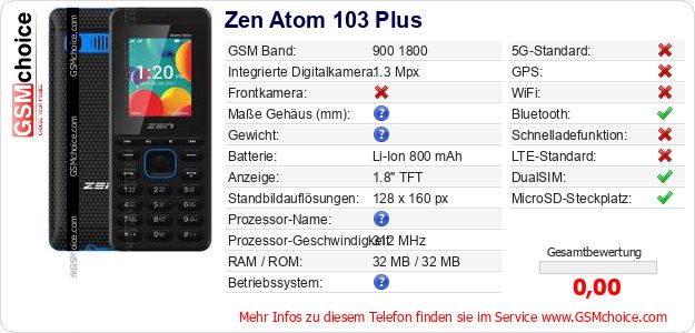Hast du eigene Webseite? Willst du die Informationen über Standarddaten des Handys Zen Atom 103 Plus irgendwo veröffentlichen? Das ist sehr einfach. Du kannst das Bild herunterladen oder kopieren und auf der Webseite folgenden Code hinzufügen:Das Einfügen von diesem Code verursacht das Anzeigen von dem folgenden Bild: