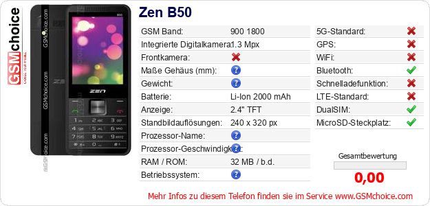 Hast du eigene Webseite? Willst du die Informationen über Standarddaten des Handys Zen B50 irgendwo veröffentlichen? Das ist sehr einfach. Du kannst das Bild herunterladen oder kopieren und auf der Webseite folgenden Code hinzufügen:Das Einfügen von diesem Code verursacht das Anzeigen von dem folgenden Bild: