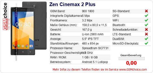 Hast du eigene Webseite? Willst du die Informationen über Standarddaten des Handys Zen Cinemax 2 Plus irgendwo veröffentlichen? Das ist sehr einfach. Du kannst das Bild herunterladen oder kopieren und auf der Webseite folgenden Code hinzufügen:Das Einfügen von diesem Code verursacht das Anzeigen von dem folgenden Bild: