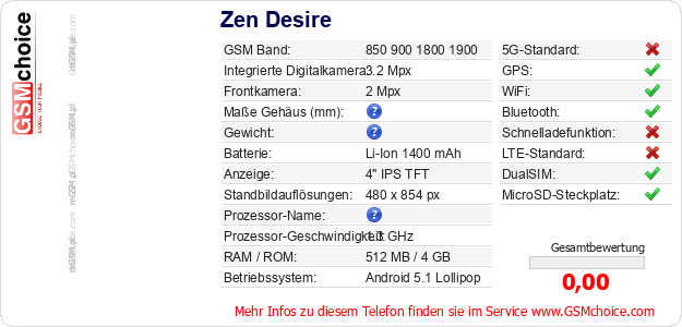 Hast du eigene Webseite? Willst du die Informationen über Standarddaten des Handys Zen Desire irgendwo veröffentlichen? Das ist sehr einfach. Du kannst das Bild herunterladen oder kopieren und auf der Webseite folgenden Code hinzufügen:Das Einfügen von diesem Code verursacht das Anzeigen von dem folgenden Bild: