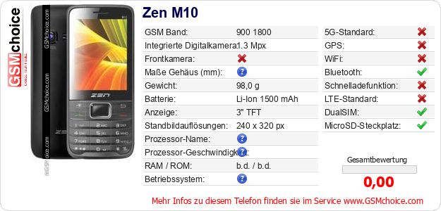 Hast du eigene Webseite? Willst du die Informationen über Standarddaten des Handys Zen M10 irgendwo veröffentlichen? Das ist sehr einfach. Du kannst das Bild herunterladen oder kopieren und auf der Webseite folgenden Code hinzufügen:Das Einfügen von diesem Code verursacht das Anzeigen von dem folgenden Bild: