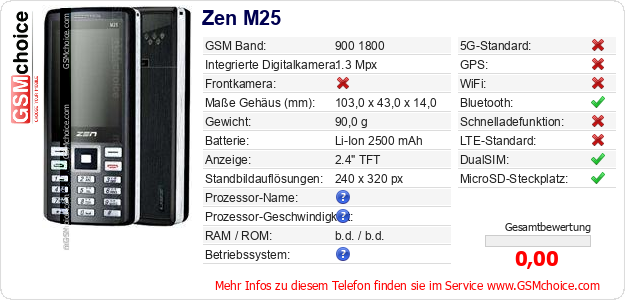 Hast du eigene Webseite? Willst du die Informationen über Standarddaten des Handys Zen M25 irgendwo veröffentlichen? Das ist sehr einfach. Du kannst das Bild herunterladen oder kopieren und auf der Webseite folgenden Code hinzufügen:Das Einfügen von diesem Code verursacht das Anzeigen von dem folgenden Bild: