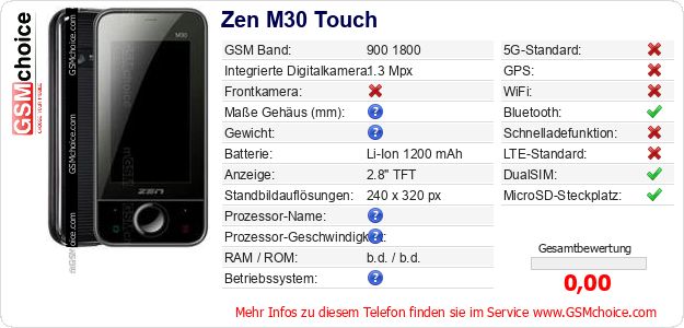 Hast du eigene Webseite? Willst du die Informationen über Standarddaten des Handys Zen M30 Touch irgendwo veröffentlichen? Das ist sehr einfach. Du kannst das Bild herunterladen oder kopieren und auf der Webseite folgenden Code hinzufügen:Das Einfügen von diesem Code verursacht das Anzeigen von dem folgenden Bild: