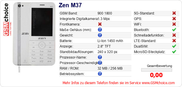 Hast du eigene Webseite? Willst du die Informationen über Standarddaten des Handys Zen M37 irgendwo veröffentlichen? Das ist sehr einfach. Du kannst das Bild herunterladen oder kopieren und auf der Webseite folgenden Code hinzufügen:Das Einfügen von diesem Code verursacht das Anzeigen von dem folgenden Bild: