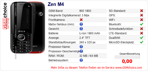 Hast du eigene Webseite? Willst du die Informationen über Standarddaten des Handys Zen M4 irgendwo veröffentlichen? Das ist sehr einfach. Du kannst das Bild herunterladen oder kopieren und auf der Webseite folgenden Code hinzufügen:Das Einfügen von diesem Code verursacht das Anzeigen von dem folgenden Bild: