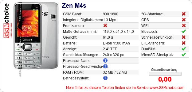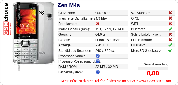 Hast du eigene Webseite? Willst du die Informationen über Standarddaten des Handys Zen M4s irgendwo veröffentlichen? Das ist sehr einfach. Du kannst das Bild herunterladen oder kopieren und auf der Webseite folgenden Code hinzufügen:Das Einfügen von diesem Code verursacht das Anzeigen von dem folgenden Bild: