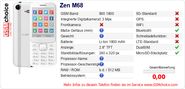 Hast du eigene Webseite? Willst du die Informationen über Standarddaten des Handys Zen M68 irgendwo veröffentlichen? Das ist sehr einfach. Du kannst das Bild herunterladen oder kopieren und auf der Webseite folgenden Code hinzufügen:Das Einfügen von diesem Code verursacht das Anzeigen von dem folgenden Bild: