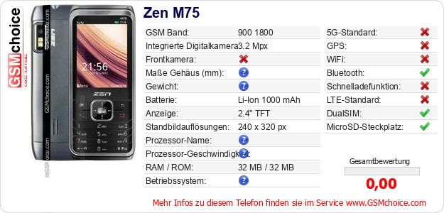 Hast du eigene Webseite? Willst du die Informationen über Standarddaten des Handys Zen M75 irgendwo veröffentlichen? Das ist sehr einfach. Du kannst das Bild herunterladen oder kopieren und auf der Webseite folgenden Code hinzufügen:Das Einfügen von diesem Code verursacht das Anzeigen von dem folgenden Bild:
