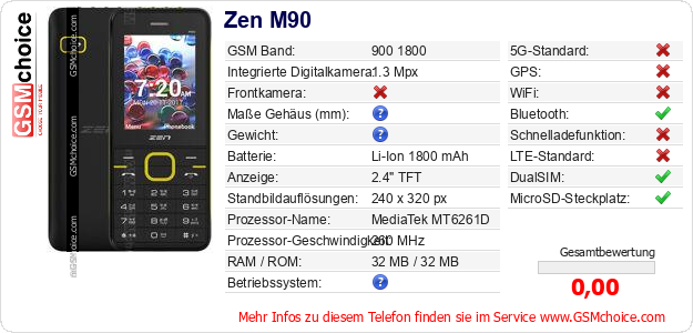 Hast du eigene Webseite? Willst du die Informationen über Standarddaten des Handys Zen M90 irgendwo veröffentlichen? Das ist sehr einfach. Du kannst das Bild herunterladen oder kopieren und auf der Webseite folgenden Code hinzufügen:Das Einfügen von diesem Code verursacht das Anzeigen von dem folgenden Bild: