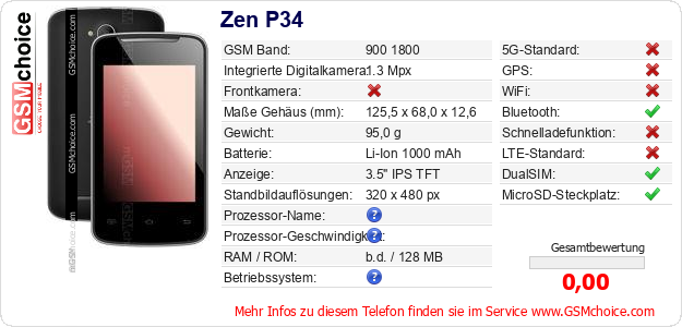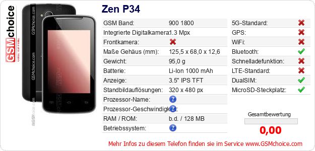Hast du eigene Webseite? Willst du die Informationen über Standarddaten des Handys Zen P34 irgendwo veröffentlichen? Das ist sehr einfach. Du kannst das Bild herunterladen oder kopieren und auf der Webseite folgenden Code hinzufügen:Das Einfügen von diesem Code verursacht das Anzeigen von dem folgenden Bild: