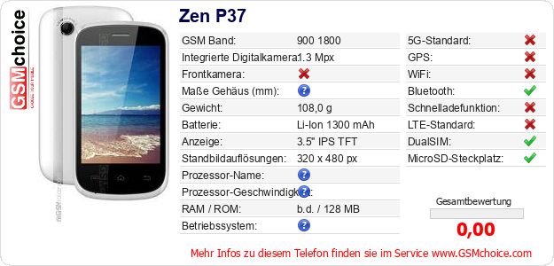 Hast du eigene Webseite? Willst du die Informationen über Standarddaten des Handys Zen P37 irgendwo veröffentlichen? Das ist sehr einfach. Du kannst das Bild herunterladen oder kopieren und auf der Webseite folgenden Code hinzufügen:Das Einfügen von diesem Code verursacht das Anzeigen von dem folgenden Bild: