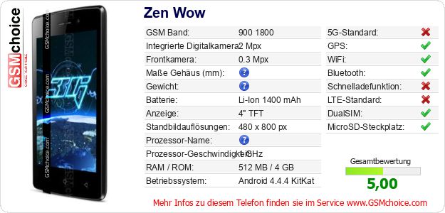 Hast du eigene Webseite? Willst du die Informationen über Standarddaten des Handys Zen Wow irgendwo veröffentlichen? Das ist sehr einfach. Du kannst das Bild herunterladen oder kopieren und auf der Webseite folgenden Code hinzufügen:Das Einfügen von diesem Code verursacht das Anzeigen von dem folgenden Bild: