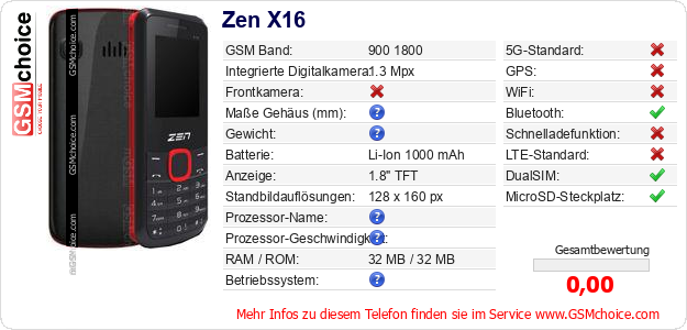 Hast du eigene Webseite? Willst du die Informationen über Standarddaten des Handys Zen X16 irgendwo veröffentlichen? Das ist sehr einfach. Du kannst das Bild herunterladen oder kopieren und auf der Webseite folgenden Code hinzufügen:Das Einfügen von diesem Code verursacht das Anzeigen von dem folgenden Bild: