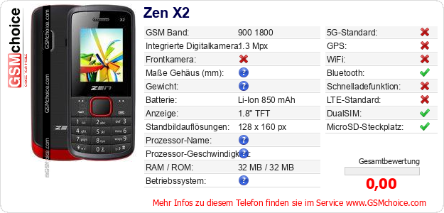 Hast du eigene Webseite? Willst du die Informationen über Standarddaten des Handys Zen X2 irgendwo veröffentlichen? Das ist sehr einfach. Du kannst das Bild herunterladen oder kopieren und auf der Webseite folgenden Code hinzufügen:Das Einfügen von diesem Code verursacht das Anzeigen von dem folgenden Bild: