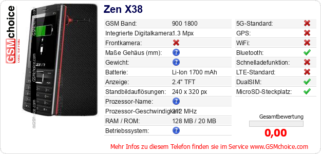 Hast du eigene Webseite? Willst du die Informationen über Standarddaten des Handys Zen X38 irgendwo veröffentlichen? Das ist sehr einfach. Du kannst das Bild herunterladen oder kopieren und auf der Webseite folgenden Code hinzufügen:Das Einfügen von diesem Code verursacht das Anzeigen von dem folgenden Bild: