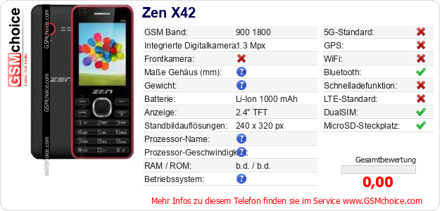 Hast du eigene Webseite? Willst du die Informationen über Standarddaten des Handys Zen X42 irgendwo veröffentlichen? Das ist sehr einfach. Du kannst das Bild herunterladen oder kopieren und auf der Webseite folgenden Code hinzufügen:Das Einfügen von diesem Code verursacht das Anzeigen von dem folgenden Bild: