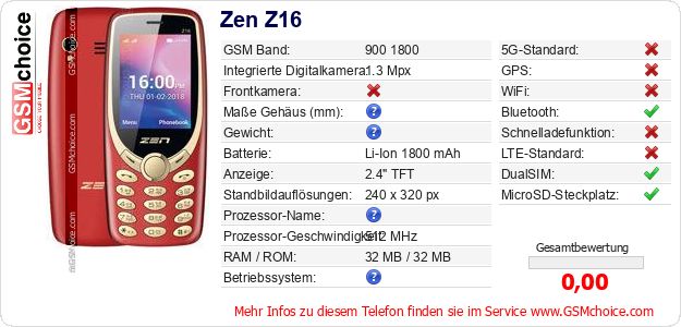 Hast du eigene Webseite? Willst du die Informationen über Standarddaten des Handys Zen Z16 irgendwo veröffentlichen? Das ist sehr einfach. Du kannst das Bild herunterladen oder kopieren und auf der Webseite folgenden Code hinzufügen:Das Einfügen von diesem Code verursacht das Anzeigen von dem folgenden Bild:
