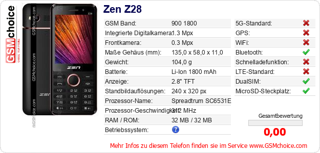 Hast du eigene Webseite? Willst du die Informationen über Standarddaten des Handys Zen Z28 irgendwo veröffentlichen? Das ist sehr einfach. Du kannst das Bild herunterladen oder kopieren und auf der Webseite folgenden Code hinzufügen:Das Einfügen von diesem Code verursacht das Anzeigen von dem folgenden Bild: