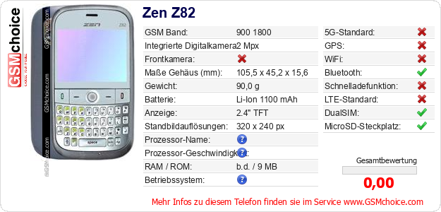 Hast du eigene Webseite? Willst du die Informationen über Standarddaten des Handys Zen Z82 irgendwo veröffentlichen? Das ist sehr einfach. Du kannst das Bild herunterladen oder kopieren und auf der Webseite folgenden Code hinzufügen:Das Einfügen von diesem Code verursacht das Anzeigen von dem folgenden Bild: