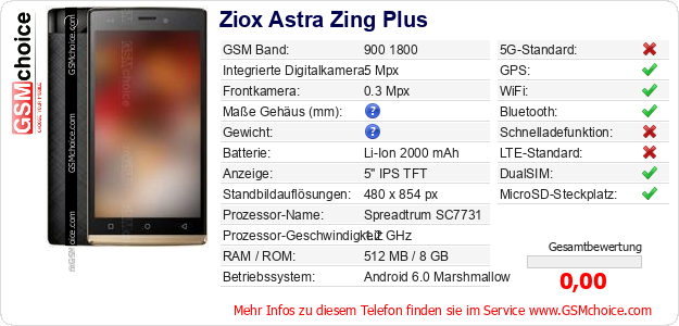 Hast du eigene Webseite? Willst du die Informationen über Standarddaten des Handys Ziox Astra Zing Plus irgendwo veröffentlichen? Das ist sehr einfach. Du kannst das Bild herunterladen oder kopieren und auf der Webseite folgenden Code hinzufügen:Das Einfügen von diesem Code verursacht das Anzeigen von dem folgenden Bild: