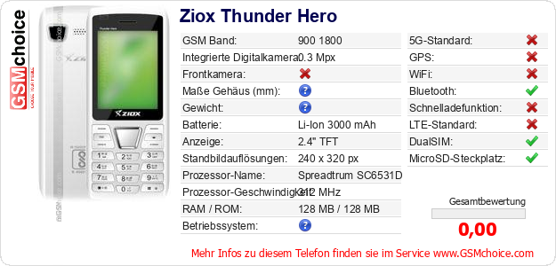 Hast du eigene Webseite? Willst du die Informationen über Standarddaten des Handys Ziox Thunder Hero irgendwo veröffentlichen? Das ist sehr einfach. Du kannst das Bild herunterladen oder kopieren und auf der Webseite folgenden Code hinzufügen:Das Einfügen von diesem Code verursacht das Anzeigen von dem folgenden Bild: