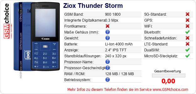 Hast du eigene Webseite? Willst du die Informationen über Standarddaten des Handys Ziox Thunder Storm irgendwo veröffentlichen? Das ist sehr einfach. Du kannst das Bild herunterladen oder kopieren und auf der Webseite folgenden Code hinzufügen:Das Einfügen von diesem Code verursacht das Anzeigen von dem folgenden Bild: