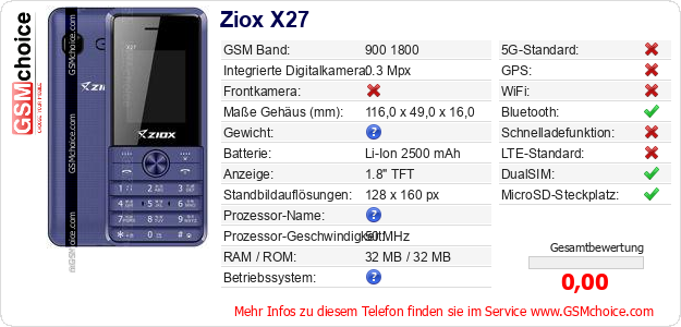 Hast du eigene Webseite? Willst du die Informationen über Standarddaten des Handys Ziox X27 irgendwo veröffentlichen? Das ist sehr einfach. Du kannst das Bild herunterladen oder kopieren und auf der Webseite folgenden Code hinzufügen:Das Einfügen von diesem Code verursacht das Anzeigen von dem folgenden Bild: