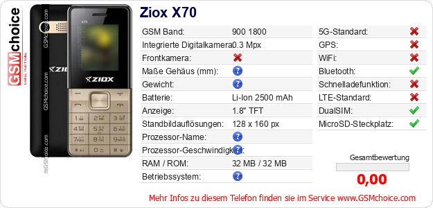 Hast du eigene Webseite? Willst du die Informationen über Standarddaten des Handys Ziox X70 irgendwo veröffentlichen? Das ist sehr einfach. Du kannst das Bild herunterladen oder kopieren und auf der Webseite folgenden Code hinzufügen:Das Einfügen von diesem Code verursacht das Anzeigen von dem folgenden Bild: