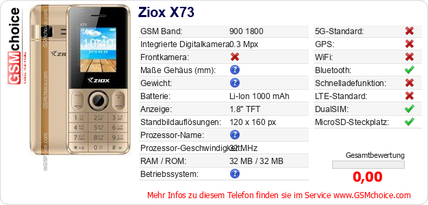 Hast du eigene Webseite? Willst du die Informationen über Standarddaten des Handys Ziox X73 irgendwo veröffentlichen? Das ist sehr einfach. Du kannst das Bild herunterladen oder kopieren und auf der Webseite folgenden Code hinzufügen:Das Einfügen von diesem Code verursacht das Anzeigen von dem folgenden Bild: