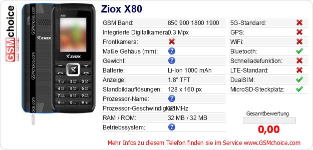 Hast du eigene Webseite? Willst du die Informationen über Standarddaten des Handys Ziox X80 irgendwo veröffentlichen? Das ist sehr einfach. Du kannst das Bild herunterladen oder kopieren und auf der Webseite folgenden Code hinzufügen:Das Einfügen von diesem Code verursacht das Anzeigen von dem folgenden Bild: