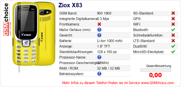 Hast du eigene Webseite? Willst du die Informationen über Standarddaten des Handys Ziox X83 irgendwo veröffentlichen? Das ist sehr einfach. Du kannst das Bild herunterladen oder kopieren und auf der Webseite folgenden Code hinzufügen:Das Einfügen von diesem Code verursacht das Anzeigen von dem folgenden Bild: