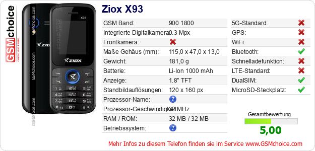 Hast du eigene Webseite? Willst du die Informationen über Standarddaten des Handys Ziox X93 irgendwo veröffentlichen? Das ist sehr einfach. Du kannst das Bild herunterladen oder kopieren und auf der Webseite folgenden Code hinzufügen:Das Einfügen von diesem Code verursacht das Anzeigen von dem folgenden Bild: