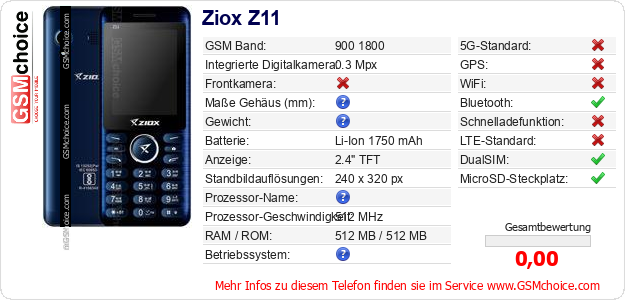Hast du eigene Webseite? Willst du die Informationen über Standarddaten des Handys Ziox Z11 irgendwo veröffentlichen? Das ist sehr einfach. Du kannst das Bild herunterladen oder kopieren und auf der Webseite folgenden Code hinzufügen:Das Einfügen von diesem Code verursacht das Anzeigen von dem folgenden Bild: