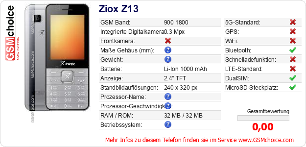 Hast du eigene Webseite? Willst du die Informationen über Standarddaten des Handys Ziox Z13 irgendwo veröffentlichen? Das ist sehr einfach. Du kannst das Bild herunterladen oder kopieren und auf der Webseite folgenden Code hinzufügen:Das Einfügen von diesem Code verursacht das Anzeigen von dem folgenden Bild: