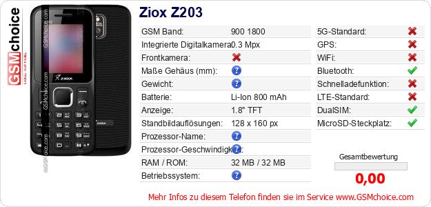Hast du eigene Webseite? Willst du die Informationen über Standarddaten des Handys Ziox Z203 irgendwo veröffentlichen? Das ist sehr einfach. Du kannst das Bild herunterladen oder kopieren und auf der Webseite folgenden Code hinzufügen:Das Einfügen von diesem Code verursacht das Anzeigen von dem folgenden Bild: