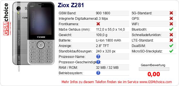 Hast du eigene Webseite? Willst du die Informationen über Standarddaten des Handys Ziox Z281 irgendwo veröffentlichen? Das ist sehr einfach. Du kannst das Bild herunterladen oder kopieren und auf der Webseite folgenden Code hinzufügen:Das Einfügen von diesem Code verursacht das Anzeigen von dem folgenden Bild:
