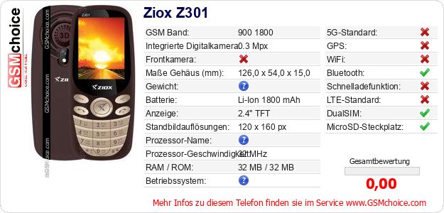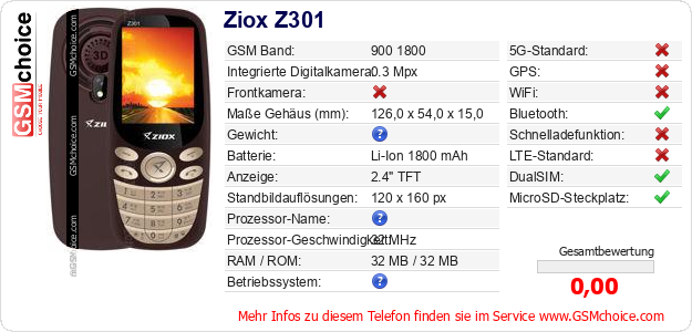 Hast du eigene Webseite? Willst du die Informationen über Standarddaten des Handys Ziox Z301 irgendwo veröffentlichen? Das ist sehr einfach. Du kannst das Bild herunterladen oder kopieren und auf der Webseite folgenden Code hinzufügen:Das Einfügen von diesem Code verursacht das Anzeigen von dem folgenden Bild: