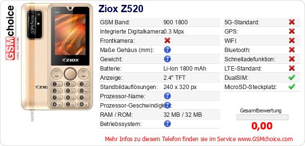 Hast du eigene Webseite? Willst du die Informationen über Standarddaten des Handys Ziox Z520 irgendwo veröffentlichen? Das ist sehr einfach. Du kannst das Bild herunterladen oder kopieren und auf der Webseite folgenden Code hinzufügen:Das Einfügen von diesem Code verursacht das Anzeigen von dem folgenden Bild: