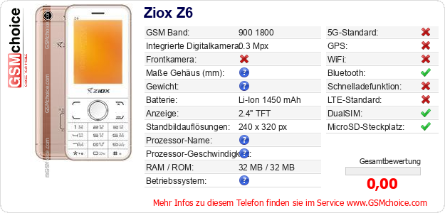 Hast du eigene Webseite? Willst du die Informationen über Standarddaten des Handys Ziox Z6 irgendwo veröffentlichen? Das ist sehr einfach. Du kannst das Bild herunterladen oder kopieren und auf der Webseite folgenden Code hinzufügen:Das Einfügen von diesem Code verursacht das Anzeigen von dem folgenden Bild: