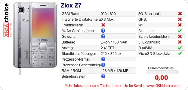 Hast du eigene Webseite? Willst du die Informationen über Standarddaten des Handys Ziox Z7 irgendwo veröffentlichen? Das ist sehr einfach. Du kannst das Bild herunterladen oder kopieren und auf der Webseite folgenden Code hinzufügen:Das Einfügen von diesem Code verursacht das Anzeigen von dem folgenden Bild: